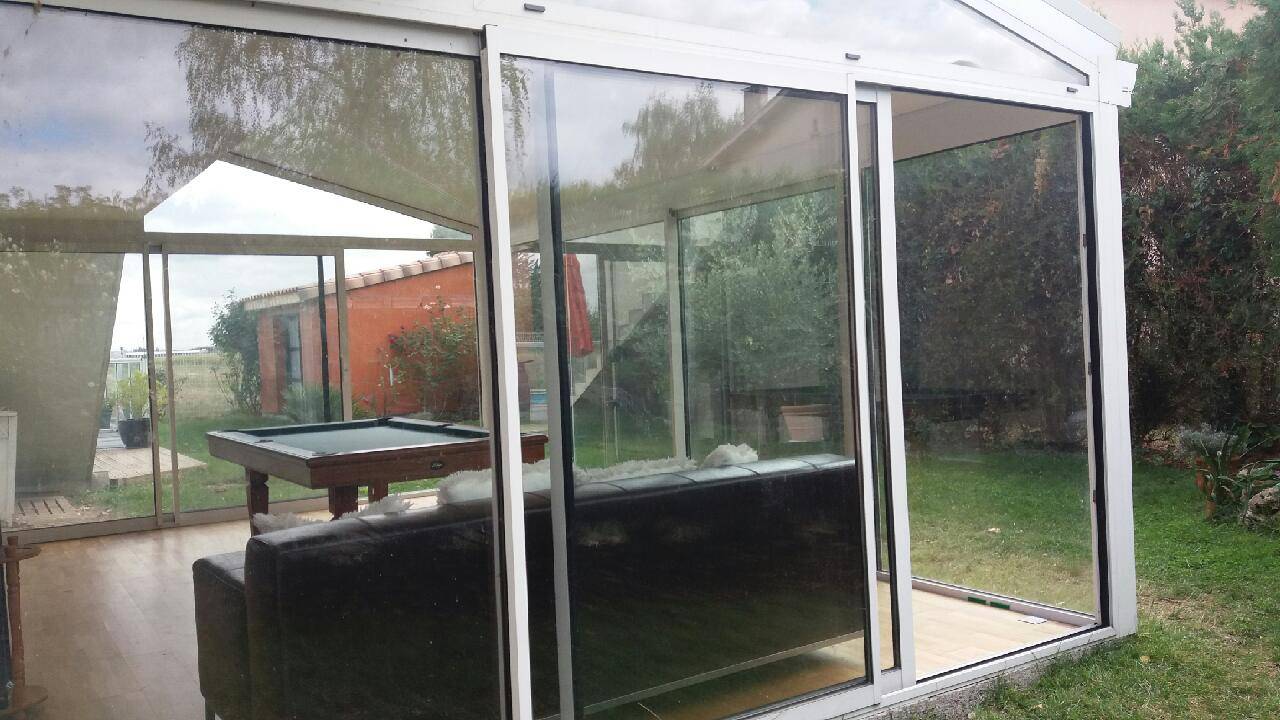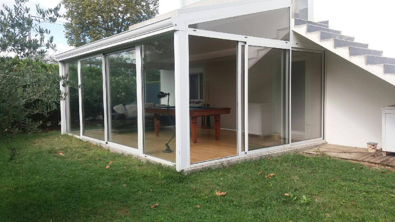 Composée de deux coulissants 3 vantaux-2 rails, d’un coulissant 4 vantaux- 2 rails avec 2 fixes latéraux et d’une toiture en panneau iso-toit autoportant d’une épaisseur de 65 mm.